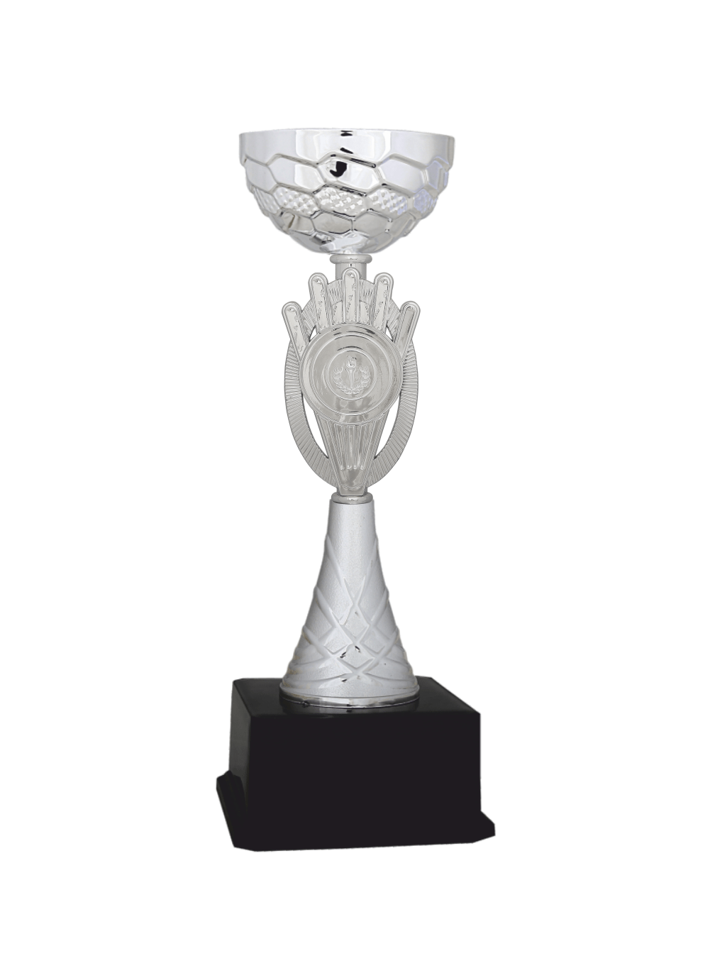 Bu kulpsuz gümüş kupa; Gümüş renk paslanmaz metal çanak, Gümüş renk özel tasarım 5 cm çapında logo alanı, Gümüş renk özel tasarım plastik kolon, Siyah sert plastik taban,