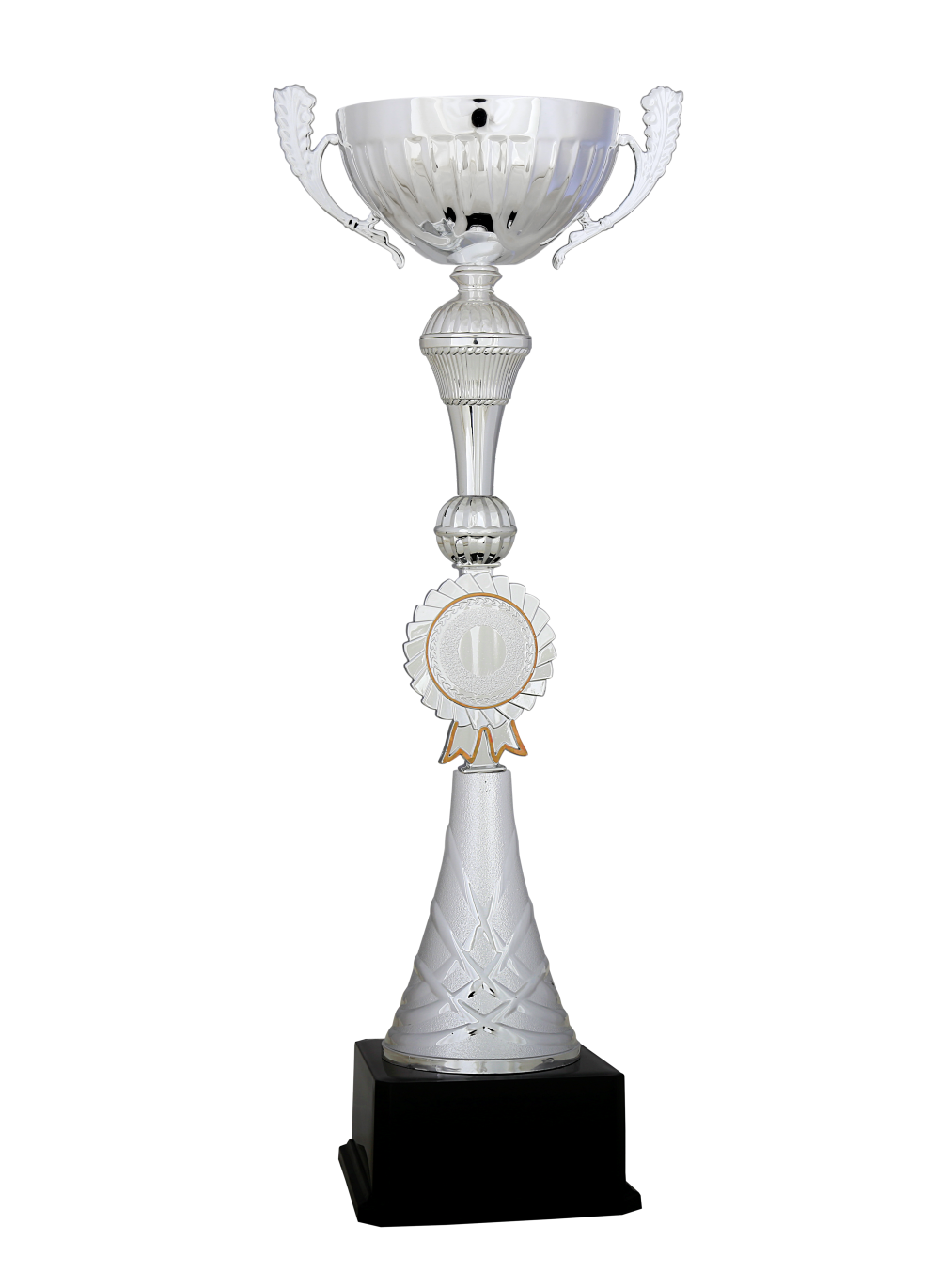 Bu kulplu gümüş kupa; Gümüş renk paslanmaz metal çanak, Gümüş renk özel tasarım 5 cm çapında logo alanı, Gümüş renk özel tasarım plastik kolon, Siyah sert plastik taban,
