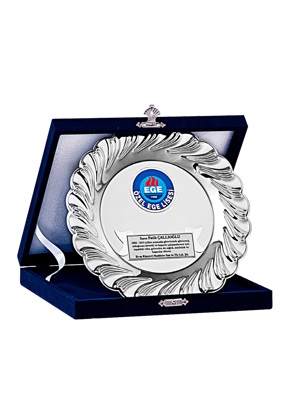 Bu plaketimiz, lacivert kadife plaket kutusu içerisinde 20 cm çapında, gümüş tabaklı plakettir. Plaketimizdeki logo alanımız 4,6 cm çapında, yazı alanımız ise özel kesim metal(fiyonk) üzerine dijital baskı olarak yapılıp ölçüsü 7x2.5 cm’dir. Genellikle emeklilik plaketi, tayin plaketi, mezuniyet plaketi, teşekkür plaketi ve ödül plaketi olarak tercih edilir.