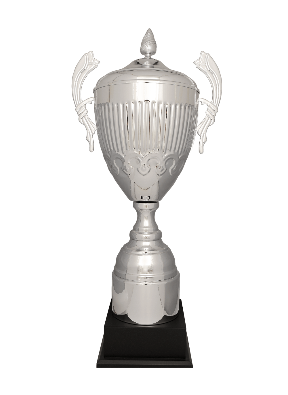 Bu Kulplu gümüş kupa; Gümüş renk paslanmaz 24 cm çapında metal çanak, Gümüş renk paslanmaz metal kapak, özel tasarımlı 5 cm spier, Metal kolon Eskitme sert ahşap taban,