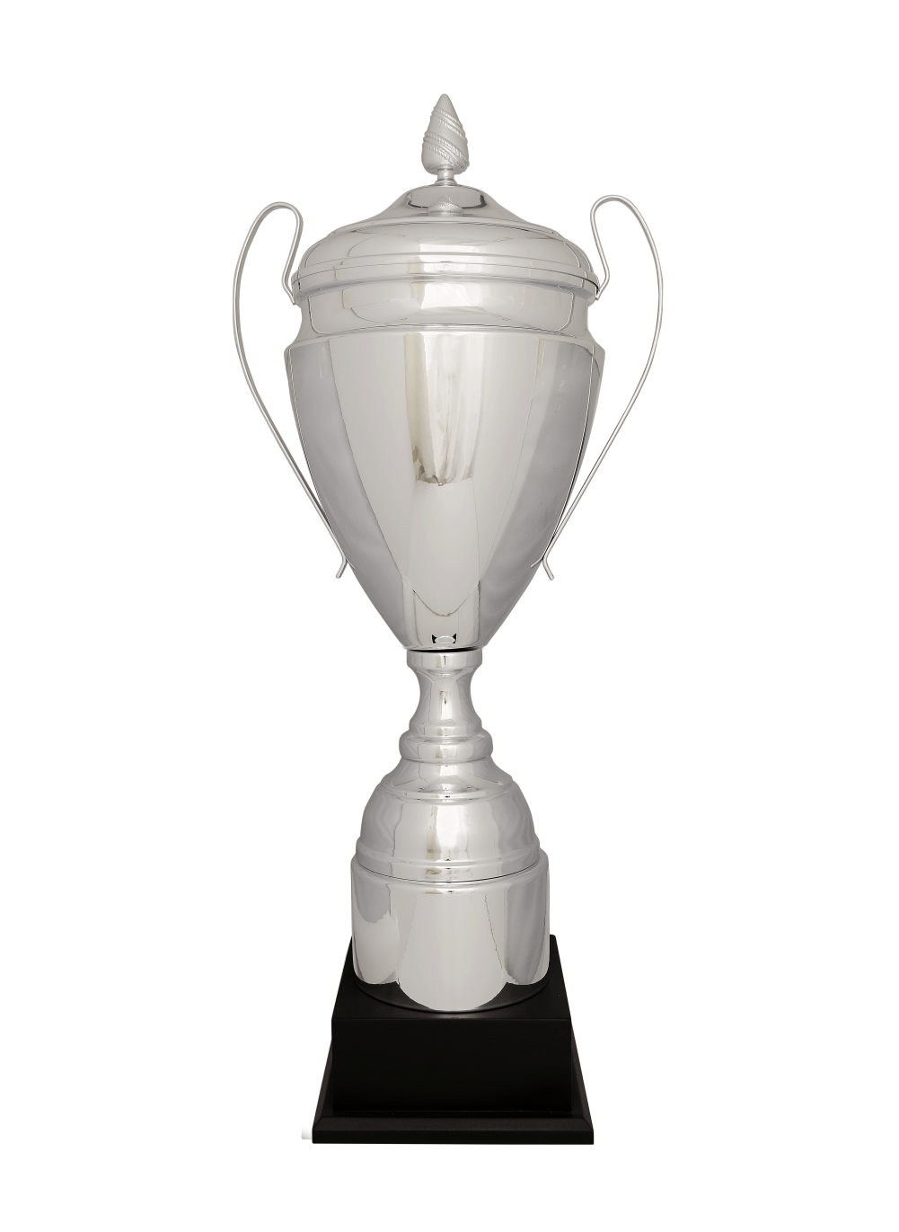 Bu Kulplu gümüş kupa; Gümüş renk paslanmaz 24 cm çapında metal çanak, Gümüş renk paslanmaz metal kapak, özel tasarımlı 5 cm spier, Metal kolon Eskitme sert ahşap taban,