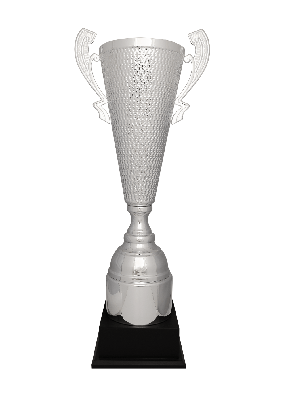 Bu Kulplu gümüş kupa; Gümüş renk paslanmaz 20 cm çapında metal çanak, Metal kolon Eskitme sert ahşap taban,
