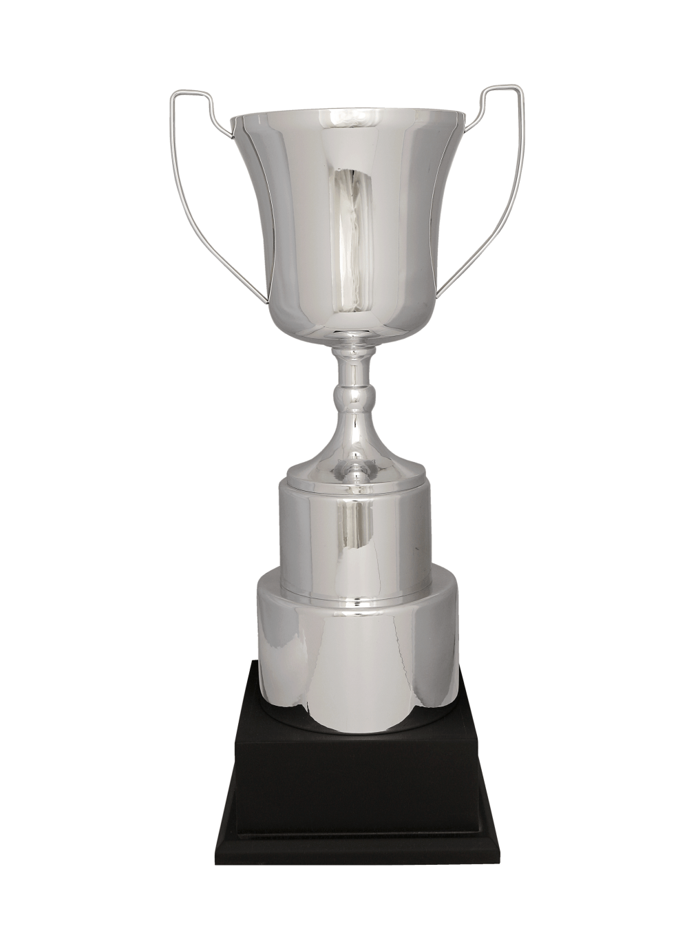 Bu Kulplu gümüş kupa; Gümüş renk paslanmaz 18 cm çapında metal çanak, Metal kolon, Eskitme sert ahşap taban,