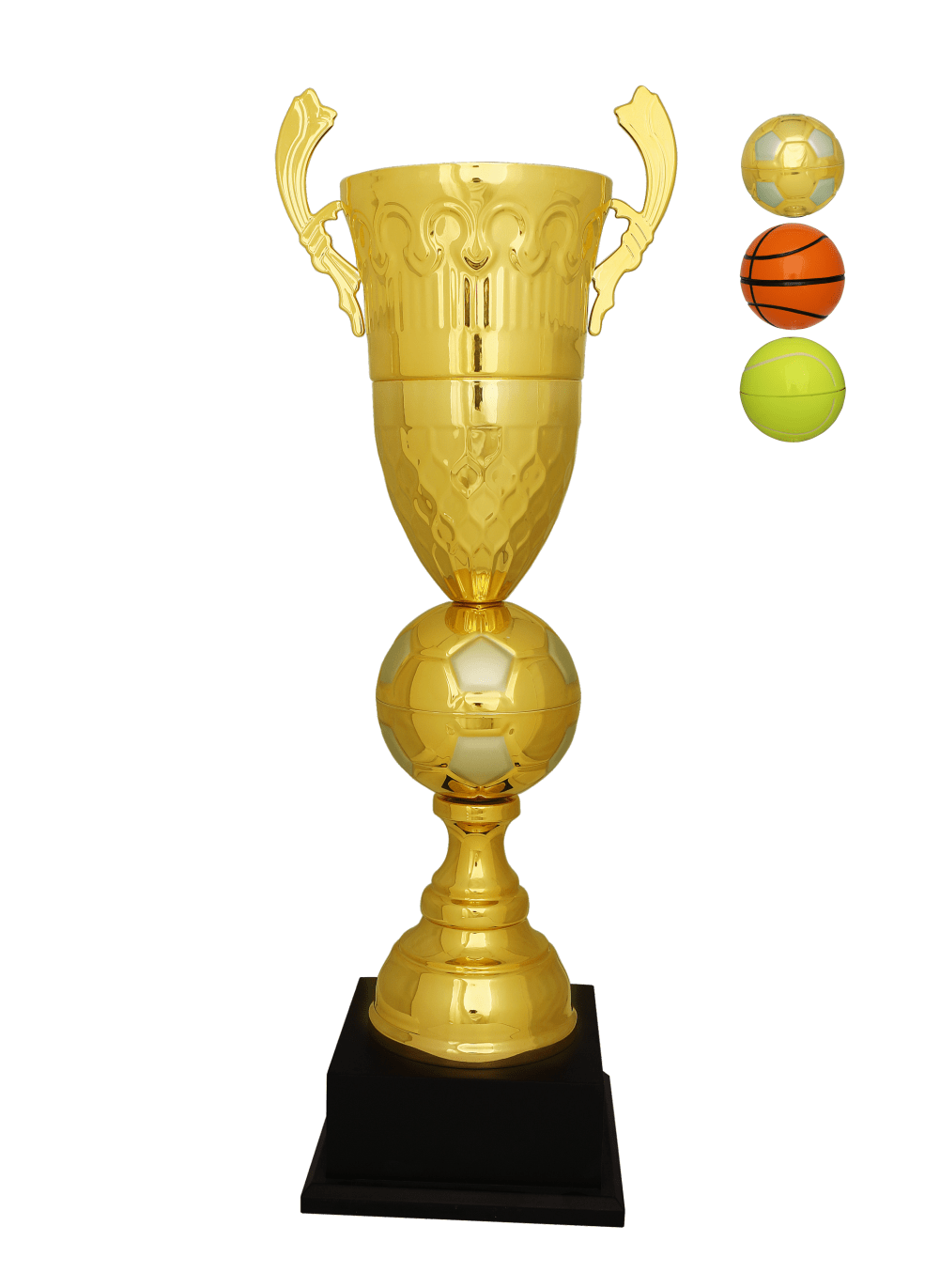 Bu Kulplu sarı kupa, 18 cm çapında metal çanak, Altın renk plastik kolon, 14 cm çapında metal top Eskitme sert ahşap taban,
