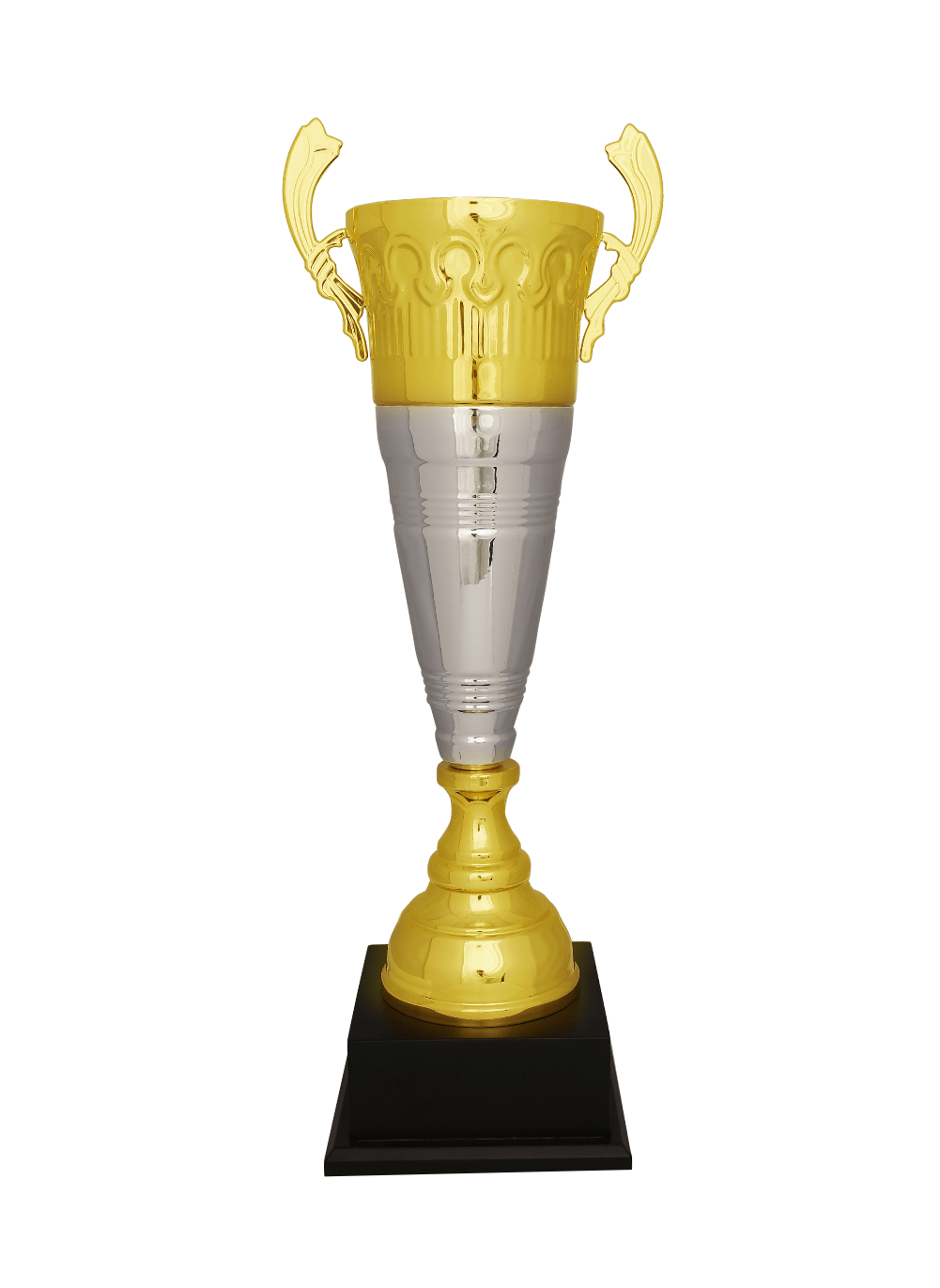 Bu kulplu sarı kupa, 18 cm çapında metal kupa Metal kolon Eskitme sert ahşap taban,